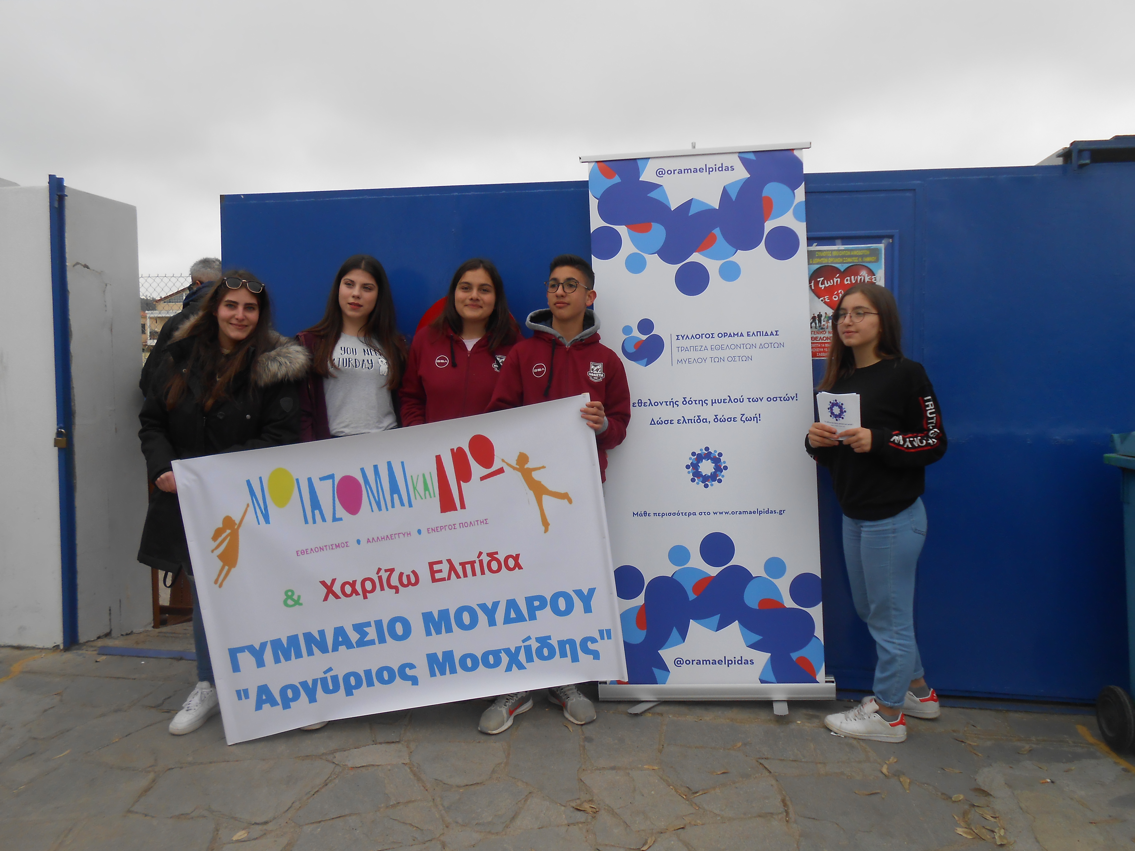 Πιο συγκεκριμένα, το Σάββατο 9 Μαρτίου 2019 το Γυμνάσιο Μούδρου σε συνεργασία με το αθλητικό σωματείο "ΚΑΕ Ήφαιστος Λήμνου" και τον σύλλογο εθελοντών δοτών μυελού των οστών "Όραμα Ελπίδας" οργάνωσε δράση αφύπνισης και κινητοποίησης. Στον τελικό Κυπέλλου μεταξύ των ποδοσφαιρικών ομάδων Ηφαιστίας Κοντοπουλίου και Διαγόρα Σαρδών μοιράσαμε ενημερωτικά φυλλάδια στους φιλάθλους ενόψει των ήδη προγραμματισμένων επικείμενων δειγματοληψιών από το "Όραμα Ελπίδας" στους αγώνες του Ηφαίστου.