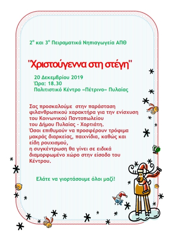 Στα πλαίσια του προγράμματος  διοργανώθηκε Χριστουγεννιάτικη θεατρική παράσταση για την ενίσχυση του Κοινωνικού Παντοπωλείου του Δήμου Πυλαίας- Χορτιάτη.