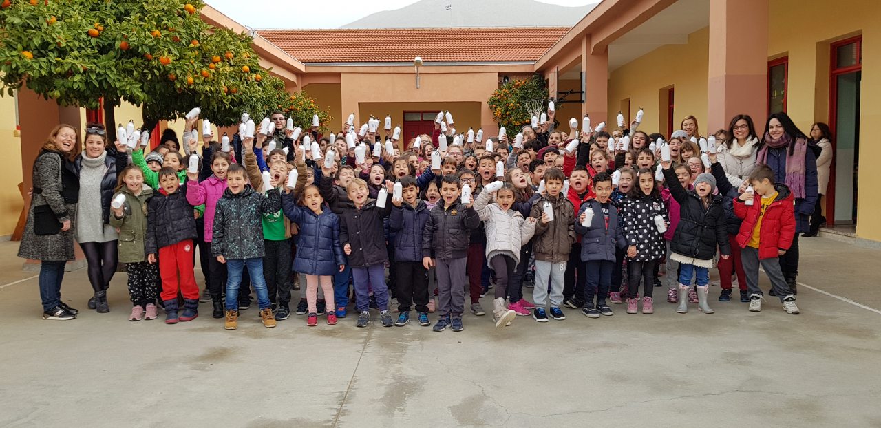 τα επαναχρησιμοποιούμενα μπουκάλια του «Νοιάζομαι & Δρω». Οι εκπαιδευτικοί