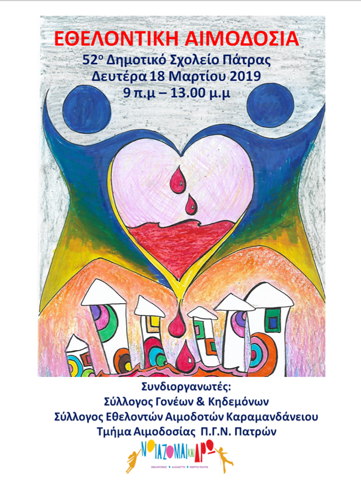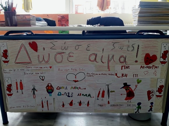 Το σχολείο  μας διοργάνωσε και φέτος – για τέταρτη συνεχή χρονιά – εθελοντική αιμοδοσία για τους συνανθρώπους μας, που την έχουν ανάγκη.  Η αιμοδοσία έγινε στο χώρο του σχολείου σήμερα 18 Μαρτίου 2019 στην αίθουσα της Α΄ τάξης, την οποία διαμορφώσαμε κατάλληλα και οι μαθητές της είχαν ετοιμάσει κολάζ με ζωγραφιές και  συνθήματα  αλλά και σελιδοδείκτες  για να υποδεχτούν τους αιμοδότες.