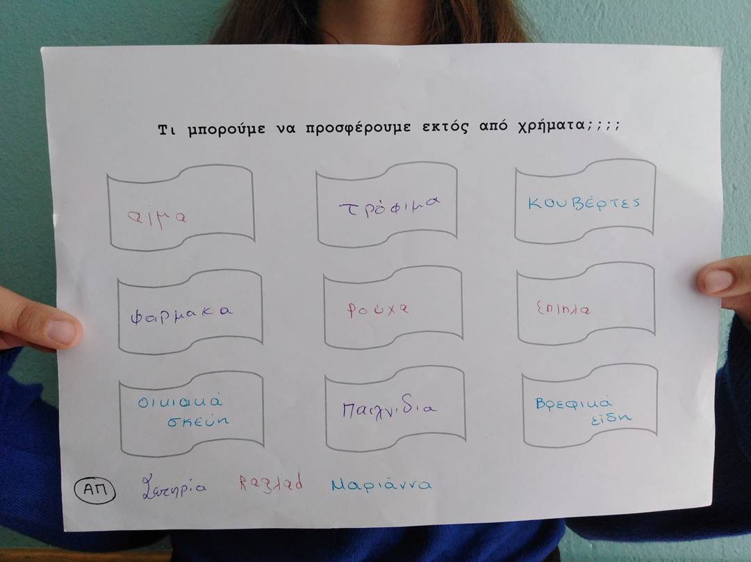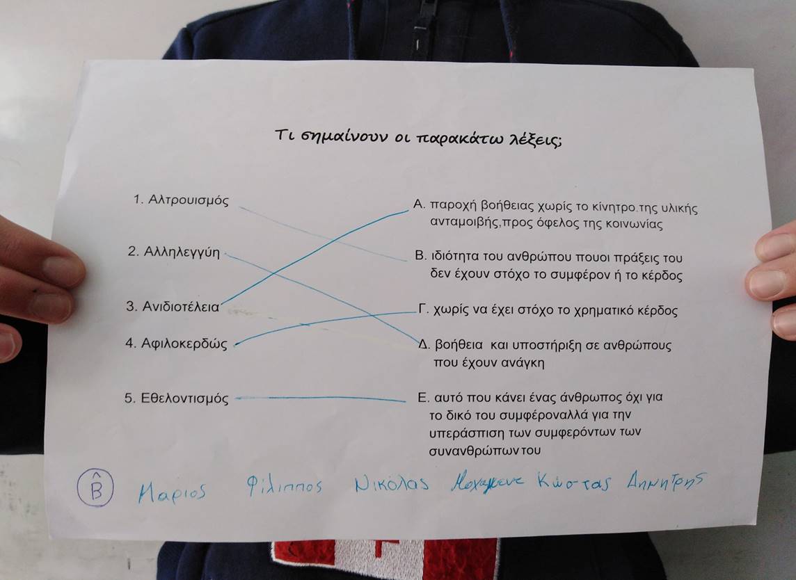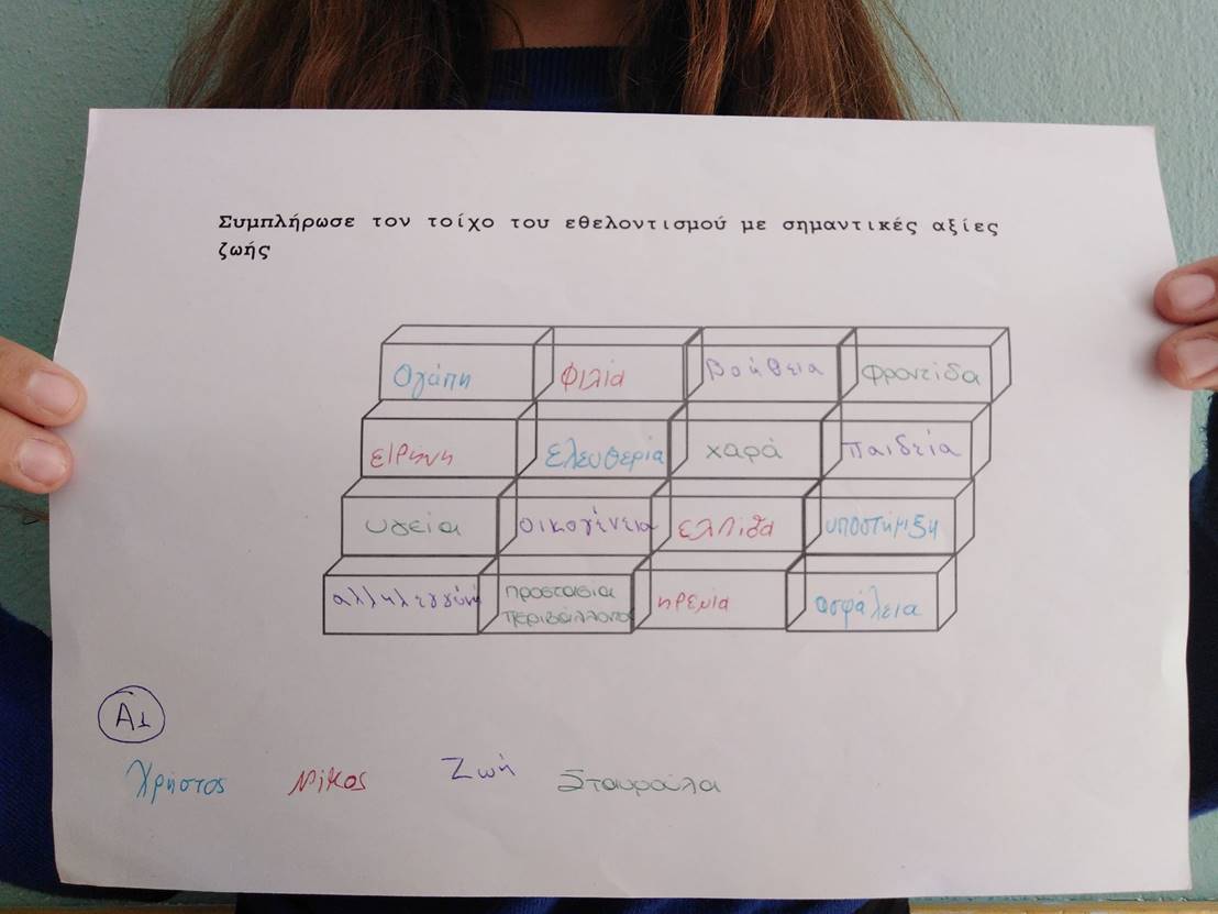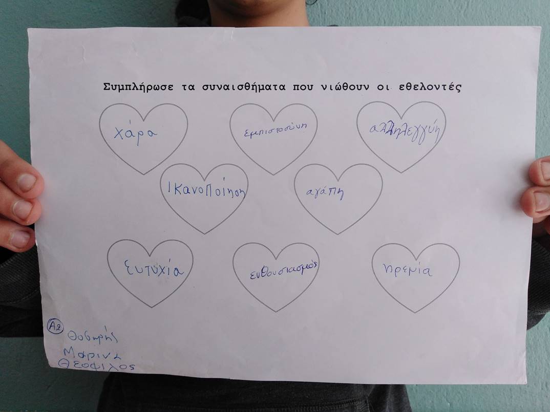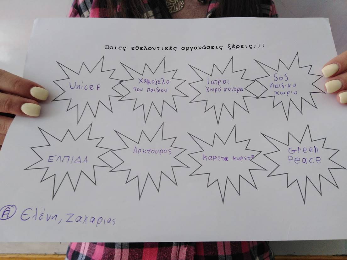 του εθελοντισμού» Αρχικά, αναρωτήθηκαν τι μπορούμε να προσφέρουμε στους συνανθρώπους μας εκτός από χρήματα. Προσπάθησαν να αισθανθούν πως νιώθει ένας εθελοντής. Έφτιαξαν τον «τοίχο του εθελοντισμού. Αναζήτησαν στο διαδίκτυο εθελοντικές οργανώσεις που δραστηριοποιούνται στη χώρα μας καθώς και τους ορισμούς σχετικών εννοιών προκειμένου να είναι σε θέση να τις διαχωρίσουν και να τις χρησιμοποιήσουν