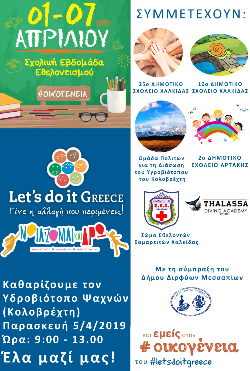 Όπως είχε ανακοινωθεί πριν λίγες μέρες, το 10ο και το 25ο Δημοτικό Χαλκίδας οργανώνουν περιήγηση και δράση καθαρισμού του υδροβιότοπου Ψαχνών στο πλαίσιο της Σχολικής Εβδομάδας Εθελοντισμού. Μαζί μας θα συμπράξουν: