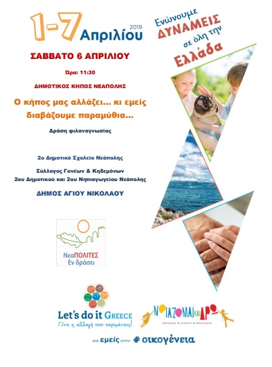Οι "ΝεαΠΟΛΙΤΕΣ εν δράσει" της ομάδας "Νοιάζομαι & Δρω" του 2ου Δημοτικού Σχολείου Νεάπολης, σε συνεργασία με τον Σύλλογο Γονέων & Κηδεμόνων του 2ου Δημοτικού και 2ου Νηπιαγωγείου Νεάπολης και τον Δήμο Αγίου Νικολάου (Κοινότητα Νεάπολης), διοργανώνει δράση φιλαναγνωσίας στον Κήπο Νεάπολης.