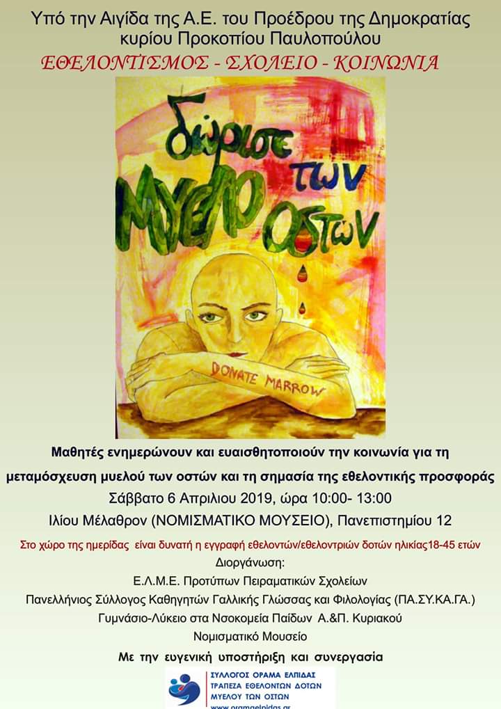 Το 27ο Γενικό Λύκειο Αθήνας συμμετέχει με την ομάδα εθελοντών του στην Ημερίδα Εθελοντισμού για την ευαισθητοποίηση σχετικά με τη μεταμόσχευση μυελού των οστών και τη σημασία του εθελοντισμού, το Σάββατο 6 Απριλίου στο Νομισματικό Μουσείο Αθηνών. Την αφίσα του προγράμματος φιλοτέχνησε η μαθήτρια του σχολείου μας Τσαντέ Κωνσταντίνα.