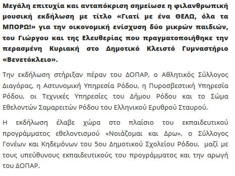 7 Απριλίου 2019 στο Δημοτικό Κλειστό Γυμναστήριο «Βενετόκλειο», η φιλανθρωπική εκδήλωση για την ενίσχυση των δύο μικρών παιδιών από τη Ρόδο.