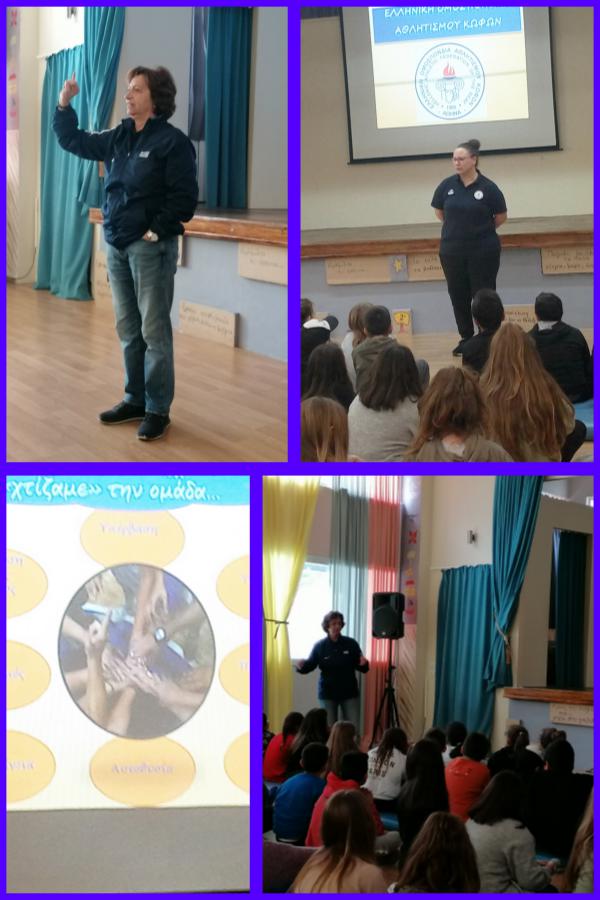 Τη Δευτέρα 27 Ιανουαρίου είχαμε τη χαρά να φιλοξενήσουμε στο σχολείο μας την κ.Ζέρβα Αθηνά, προπονήτρια, και την κ.Αργυρίου Μάρθα, βοηθό προπονήτριας,  της Ελληνικής Εθνικής Ομάδας Μπάσκετ Κωφών Γυναικών. Μας παρουσίασαν  τις δράσεις και τις επιτυχίες της χρυσής ομάδας, καθώς και τις προσπάθειες που γίνονται στο χώρο του Αθλητισμού των κωφών-Βαρήκοων αθλητών.