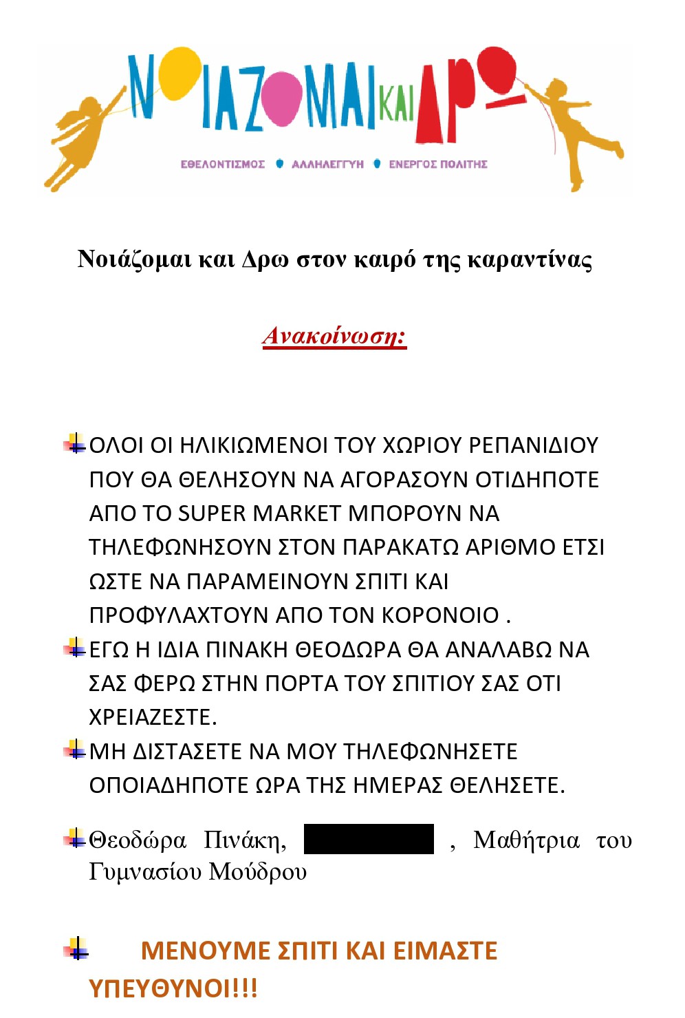 Η Θεοδώρα και η μητέρα της ετοίμασαν μία ανακοίνωση με την οποία προτρέπουν τους ηλικιωμένους να μένουν μέσα, ενώ οι ίδιες πρόθυμα θα αγοράζουν και θα μεταφέρουν στο σπίτι τους όσα είδη τους είναι απαραίτητα. Έτσι, χωρίς κόπο θα έχουν τα τρόφιμα που χρειάζονται και θα μένουν σπίτι χωρίς να θέτουν τον εαυτό τους σε πιθανό κίνδυνο. Η ανακοίνωση τοποθετήθηκε δημόσια και η Θεοδώρα με τη μητέρα της έχουν ήδη βοηθήσει με αυτόν τον μοναδικό τρόπο.