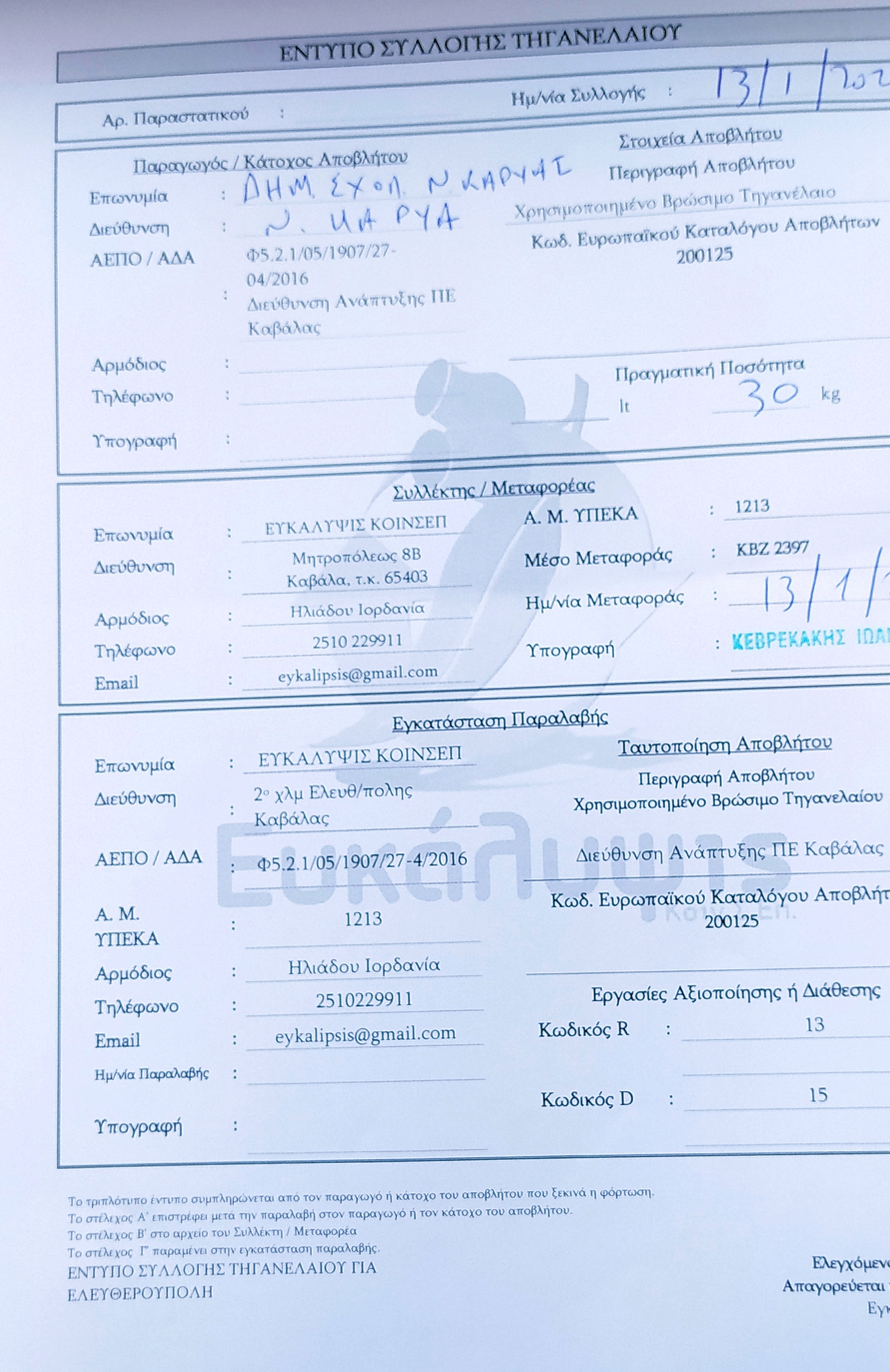 Μία από τις πολλές δράσεις είναι και η συλλογή τηγανέλαιου σε συνεργασία με την εταιρεία ΕΥΚΑΛΥΨΙΣ. Υπάλληλος της εταιρείας ήρθε στο σχολείο μας και παρέλαβε την ποσότητα τηγανέλαιων που συνέλεξαν τα παιδιά
