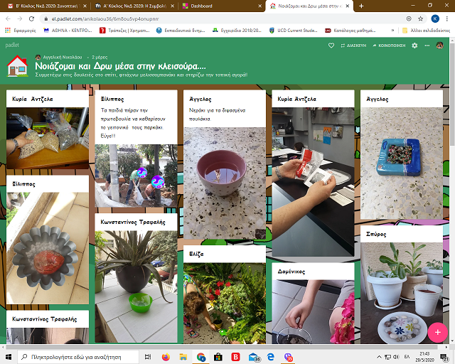 Μέσα στην περίοδο της καραντίνας δημιουργήσαμε τον δικό μας πίνακα ανακοινώσεων του Νοιάζομαι και Δρω μέσω PADLET. Καταφέραμε έτσι να  μεταφέρουμε την γωνιά του προγράμματος από την τάξη μας, στο σπίτι μας!