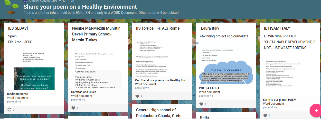 Οι μαθητές έγραψαν σε συνεργατικό εργαλείο google doc ποίημα για την Παγκόσμια Ημέρα Περιβάλλοντος  5 Ιουνίου και το μοιράστηκαν με συμμαθητές τους από πολλές χώρες του εξωτερικού μέσω ψηφιακής αφίσας . Το σχολέιο μας  έχει λάβει ετικέττα ποιότητας
