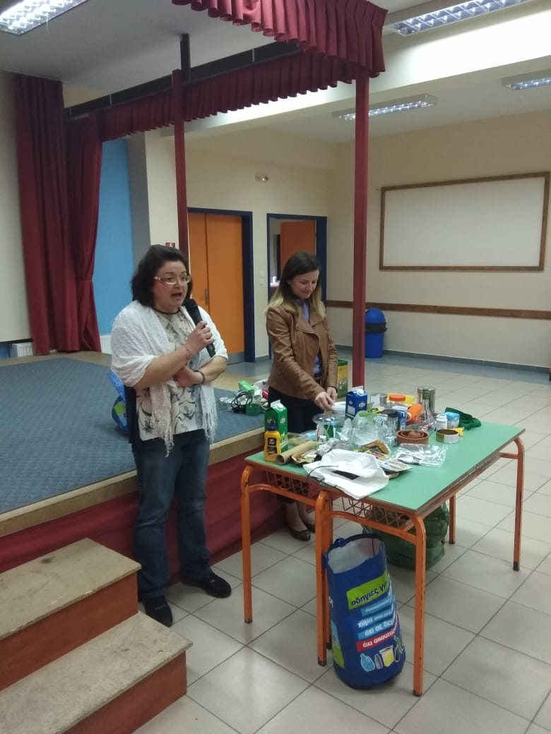 Το μήνυμα της ανακύκλωσης επιχείρησε να περάσει στους μαθητές μας η κα Χαυτίκη Ελένη, προϊσταμένη του τμήματος Εναλλακτικής Διαχείρισης της Διεύθυνσης Καθαριότητας και Ανακύκλωσης του Δήμου Λάρισας. Η ομιλία της για την ανακύκλωση βασίστηκε στο τρίπτυχο ΠΕΡΙΟΡΙΖΩ - ΕΠΑΝΑΧΡΗΣΙΜΟΠΟΙΩ - ΑΝΑΚΥΚΛΩΝΩ. Ενημέρωσε τους μαθητές για: