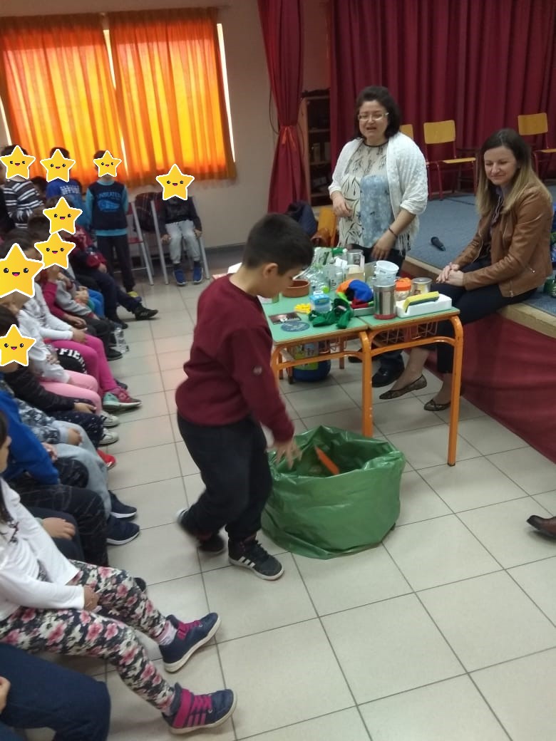 Στη συνέχεια, οργάνωσε ένα παιχνίδι προκειμένου να μάθουν οι μικροί μαθητές δια της βιωματικής εμπειρίας το διαχωρισμό των απορριμμάτων (χαρτιού, γυαλιού, πλαστικού, αλουμινίου, ηλεκτρικών και ηλεκτρονικών μικροσυσκευών, λαμπτήρων, μπαταριών κτλ). Ο κάθε μαθητής καλούνταν να περιεργαστεί το αντικείμενο - απόρριμμα που του δινόταν και να το ρίξει στο σωστό κάδο.