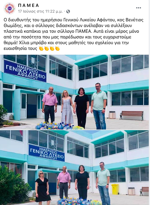 Το ΓΕΛ ΑΦΑΝΤΟΥ στα πλαίσια του προγράμματος «ΝΟΙΑΖΟΜΑΙ ΚΑΙ ΔΡΩ» συγκέντρωσε σακούλες με πλαστικά πώματα που μάζεψαν οι μαθητές και οι γονείς τους κατά τη διάρκεια της χρονιάς. Τα πώματα παραδόθηκαν στο σύλλογο ΠΑΜΕΑ, που βοηθα ανθρώπους με ειδικές ικανότητες.