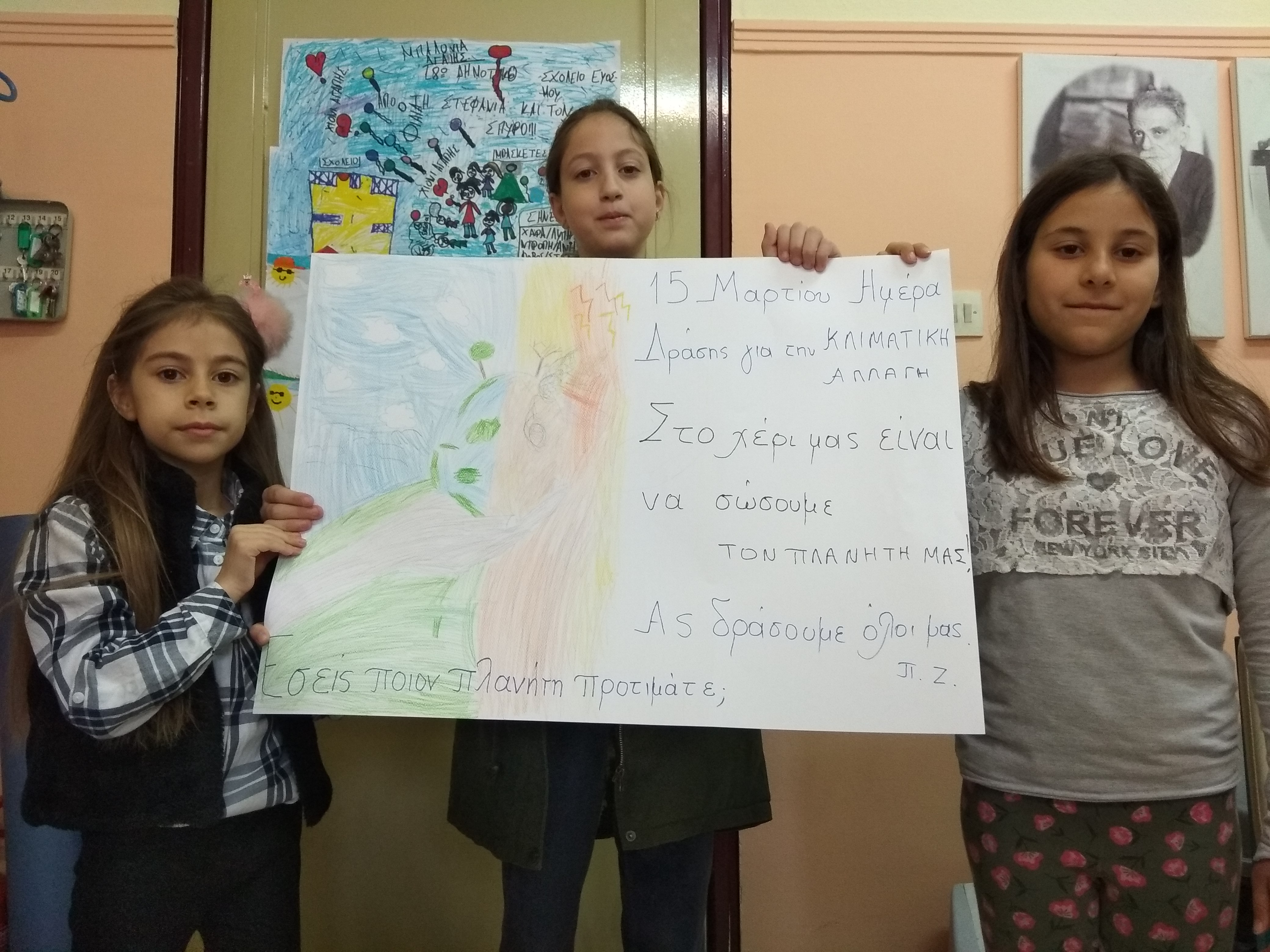 Στα πλαίσια της ημέρας δράσης για την κλιματική αλλαγή ομάδα είδαμε την παρουσίαση https://climatecreteschools.blogspot.com/2019/03/blog-post_47.html?view=magazine&fbclid=IwAR0glSZ9kxxZLJv36gDJ5-nsVZyuwidZmeZjmJGm4e_rxiTNfqGjIw9fMKE που δημιουργήθηκε από το ΚΠΕ ΒΑΜΟΥ και προβληματιστήκαμε για την κλιματική αλλαγή. Στη συνέχεια, μαθήτριες της Πρωινής Ζώνης δημιούργησαν μια σχετική αφίσα και  ενημέρωσαν στην πρωινή σύναξη τη σχολική κοινότητα για τις συνέπειες της κλιματικής αλλαγής. Στο τέλος, προέτρεψαν τους εκπαιδευτικούς και τους μαθητές ως συμβολική κίνηση να προσπαθήσουν να μην ανάψουν τα φώτα σήμερα.