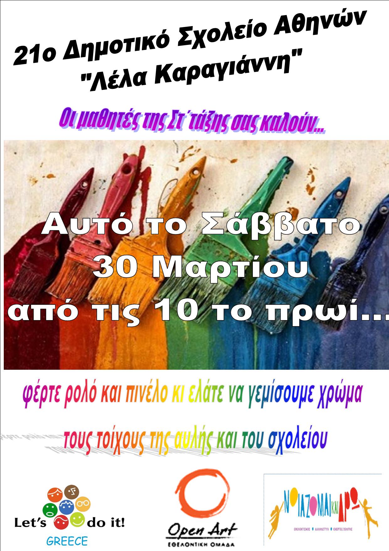 Εθελοντικές ομάδες, γονείς, δάσκαλοι και μαθητές βάφουμε τους τοίχους και ομορφαίνουμε την αυλή του σχολείου. Η ιδέα, η οργάνωση και ο συντονισμός όλης της δράσης έγινε από τους μαθητές της Στ΄τάξης.