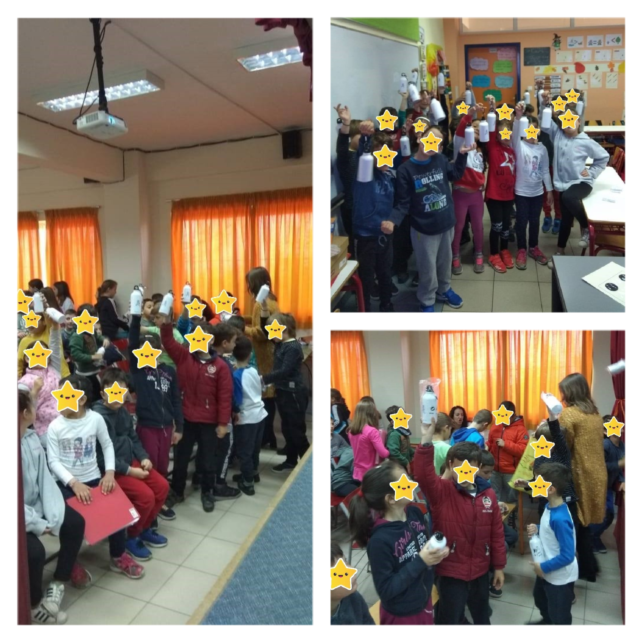 Την Τρίτη 19 Μαρτίου πραγματοποιήθηκε στο σχολείο μας γιορτή ανακύκλωσης, στην οποία ήταν καλεσμένοι και παρευρέθηκαν ορισμένοι γονείς. Την έναρξη της εκδήλωσης σήμανε η κα Καλλιόπη Δουδούκα με την ομιλία της και την προσπάθεια ευαισθητοποίησης των μαθητών αναφορικά με την προστασία του περιβάλλοντος. Μίλησε για τα απορρίμματα και συγκεκριμένα για τα πλαστικά σκουπίδια.