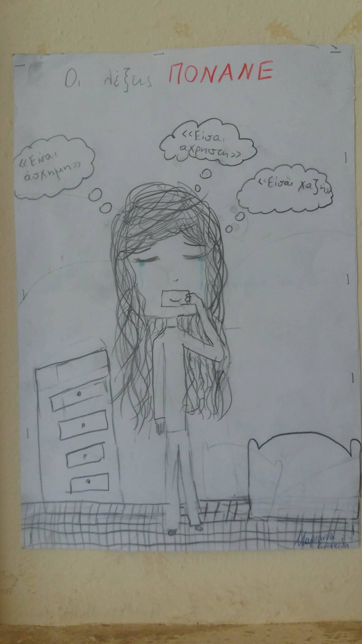 Με υλικά από τον κάδο ανακύκλωσης (χαρτόνια, κούτες κ.ά.) δημιούργησαν μοναδικά γλυπτά με περιεχόμενο κατά της σχολικής βίας, ενώ παράλληλα φιλοτέχνησαν αφίσες με αντίστοιχα μηνύματα.