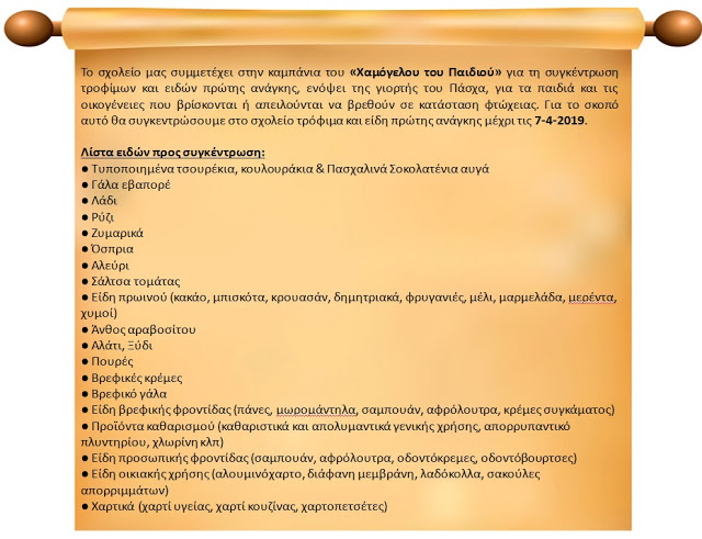 Οι μαθητές όλων των τάξεων του Δημοτικού Σχολείου Νέας Καρυάς συμμετέχουν στην καμπάνια του "Χαμόγελου του Παιδιού" και προσφέρουν τρόφιμα και είδη πρώτης ανάγκης αποδεικνύοντας στην πράξη πως "νοιάζονται και δρουν" για τον συνάνθρωπό τους.