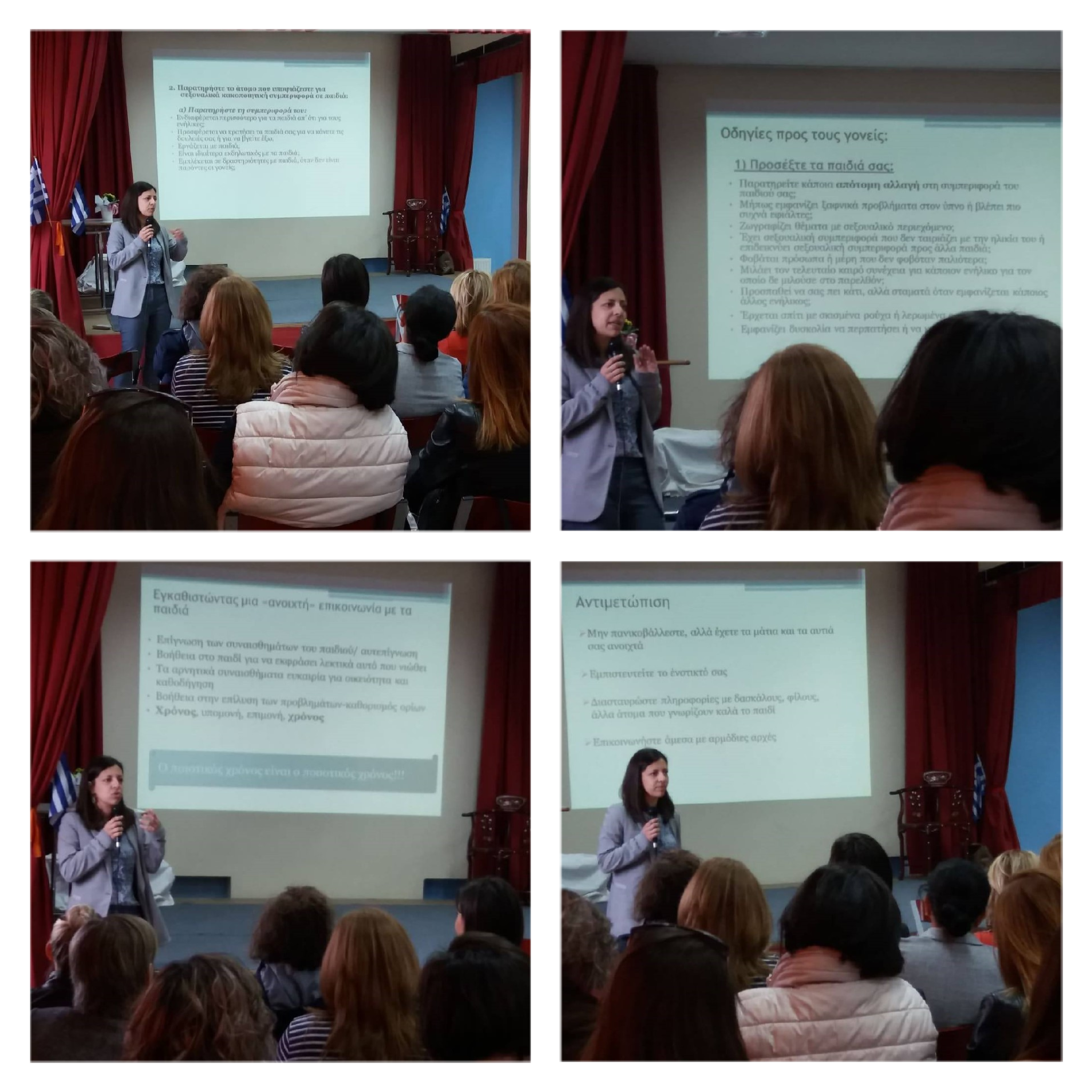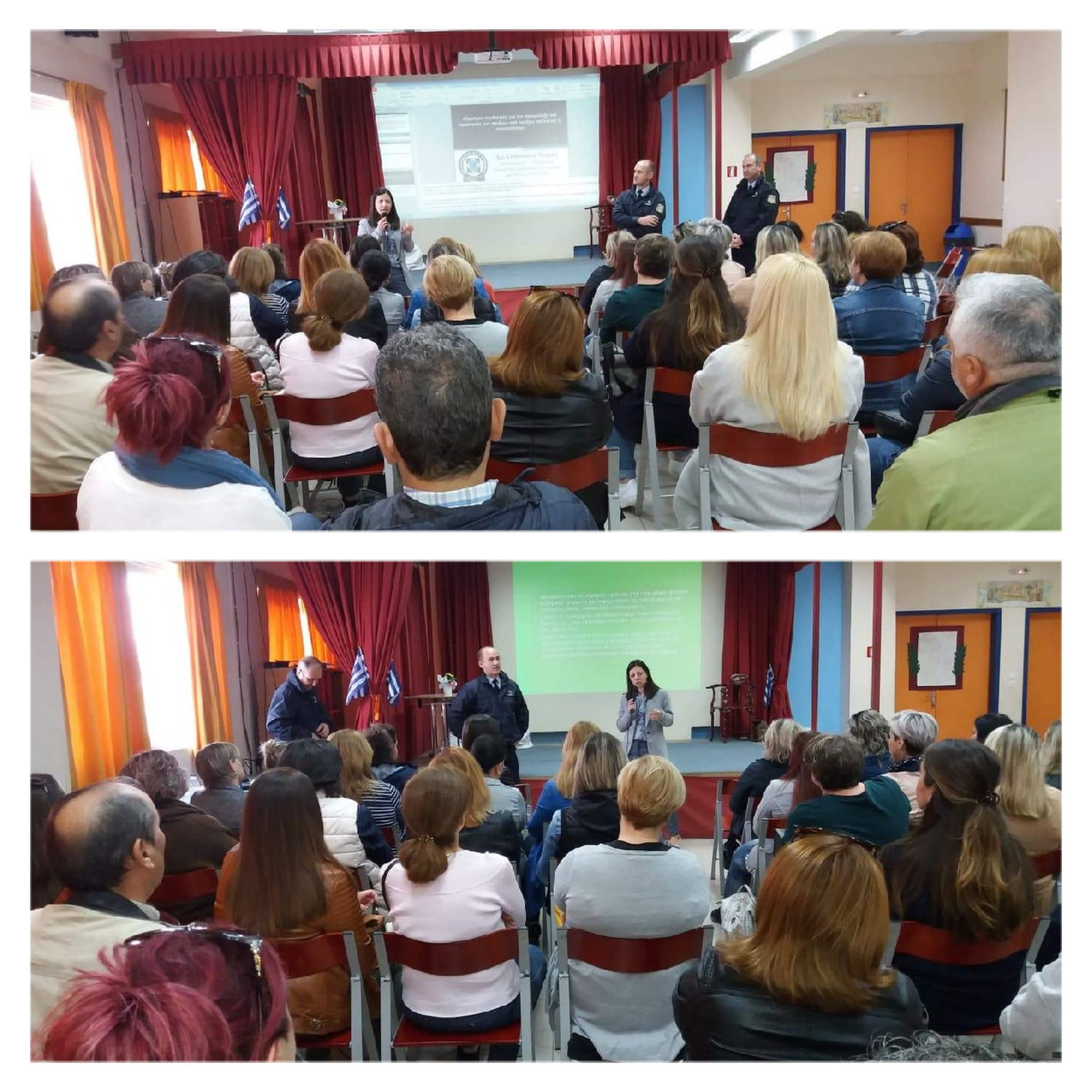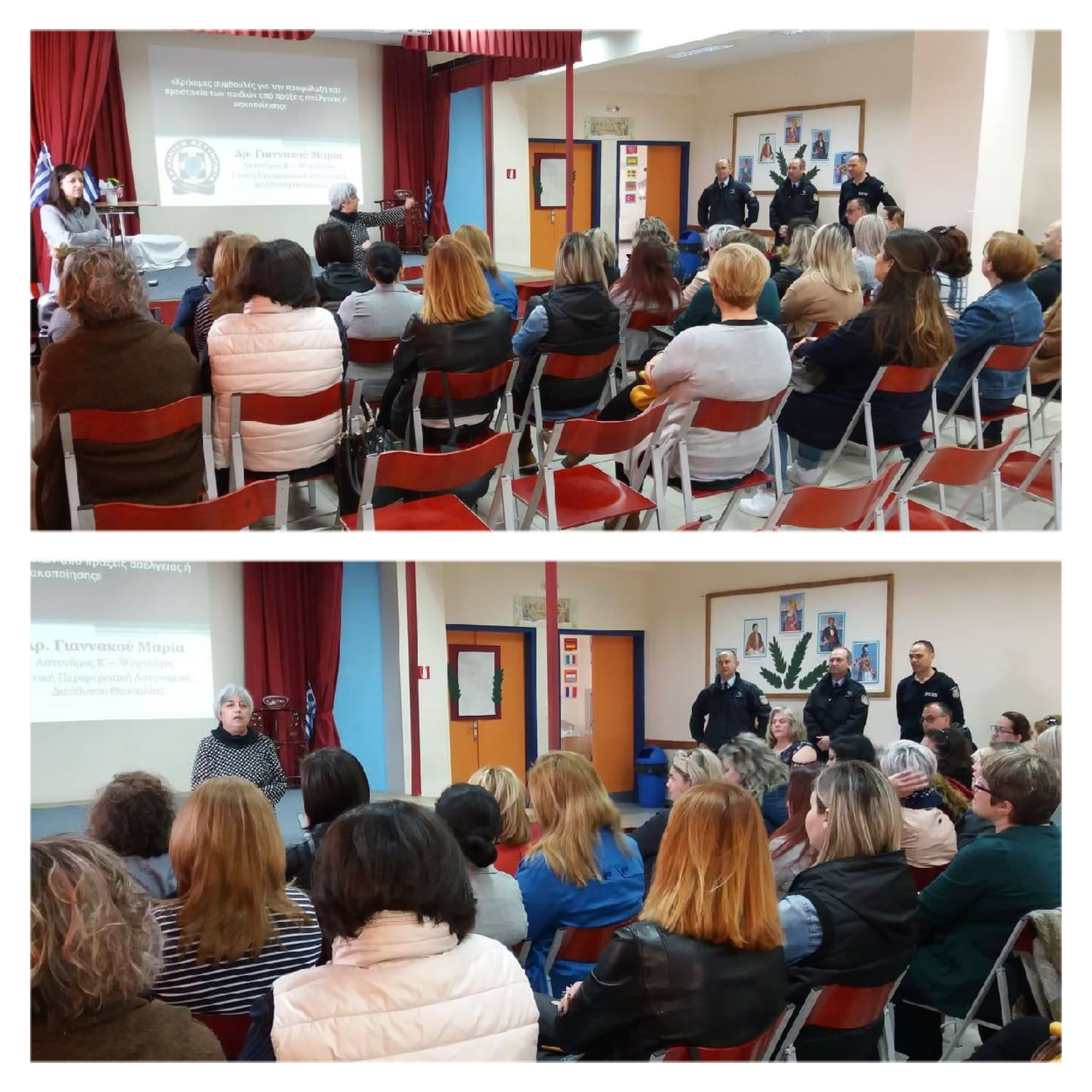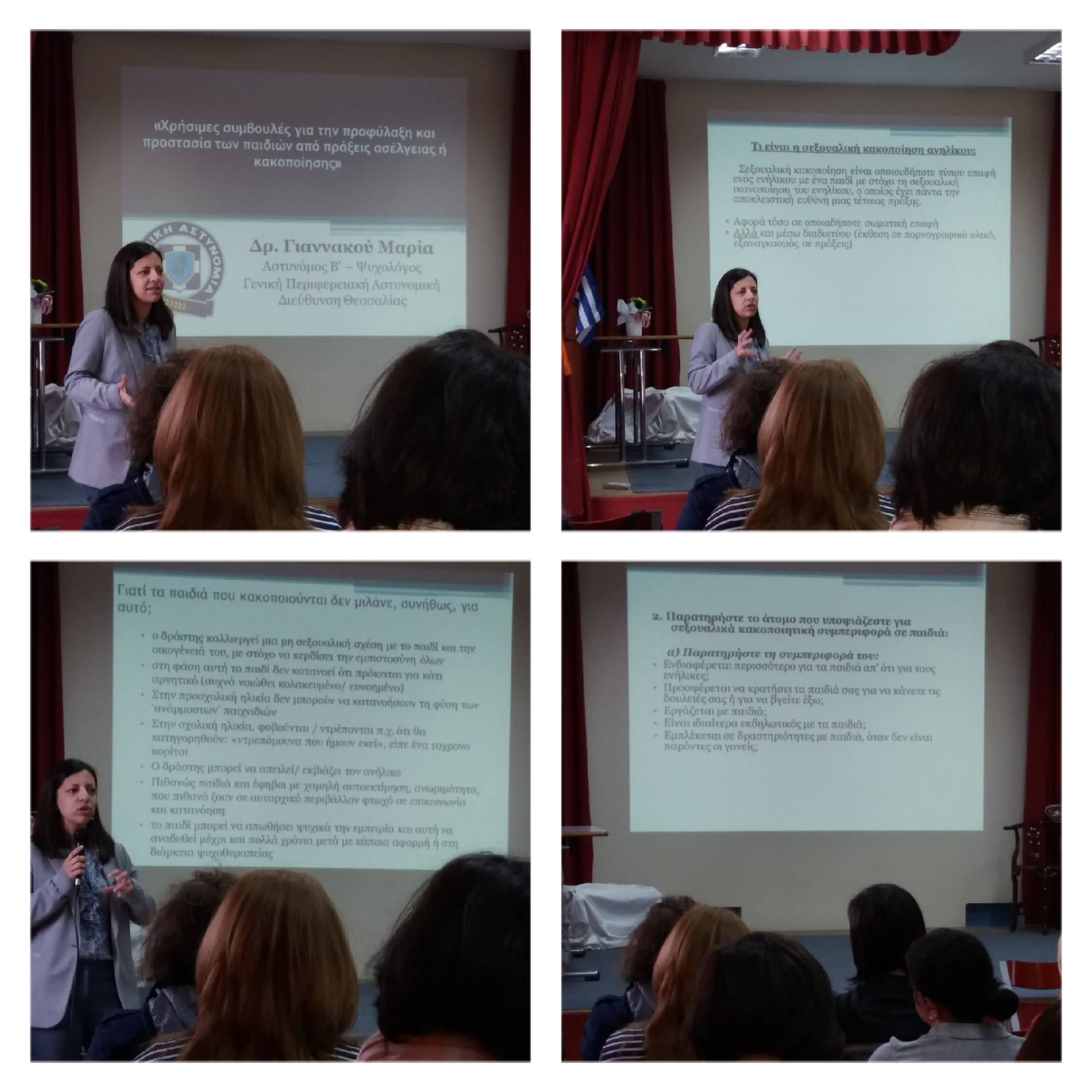 Την Πέμπτη 21 Μαρτίου, με αφορμή την έλευση των γονέων στο σχολείο μας για την ενημέρωσή τους και την επίδοση βαθμολογίας, είχαμε τη χαρά να έχουμε και πάλι κοντά μας τους αστυνομικούς της γειτονιάς, καθώς και τη ψυχολόγο κα Μαρία Γιαννακού. Η κα Γιαννακού ανέπτυξε το θέμα της σεξουαλικής κακοποίησης των ανηλίκων και έδωσε στους γονείς τόσο οδηγίες για να αναγνωρίζουν τα σημάδια εκείνα που μαρτυρούν την περίπτωση το παιδί τους να έχει πέσει θύμα σεξουαλικής κακοποίησης, όσο και συμβουλές για την αντιμετώπιση αυτής της κατάστασης.