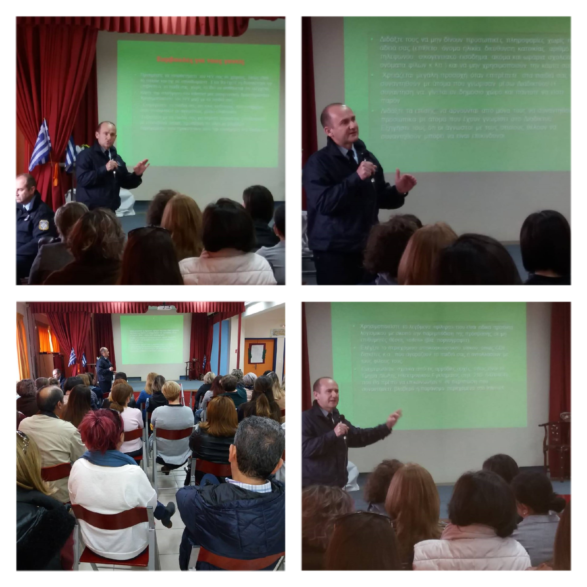 Στη συνέχεια, ο αστυνομικός της γειτονιάς κος Μπότας έδωσε στους γονείς γενικές συμβουλές για το διαδίκτυο, τονίζοντας το ρόλο του γονέα στην αποφυγή των ενδεχόμενων κινδύνων που επιφυλάσσει το διαδίκτυο για το παιδί τους.