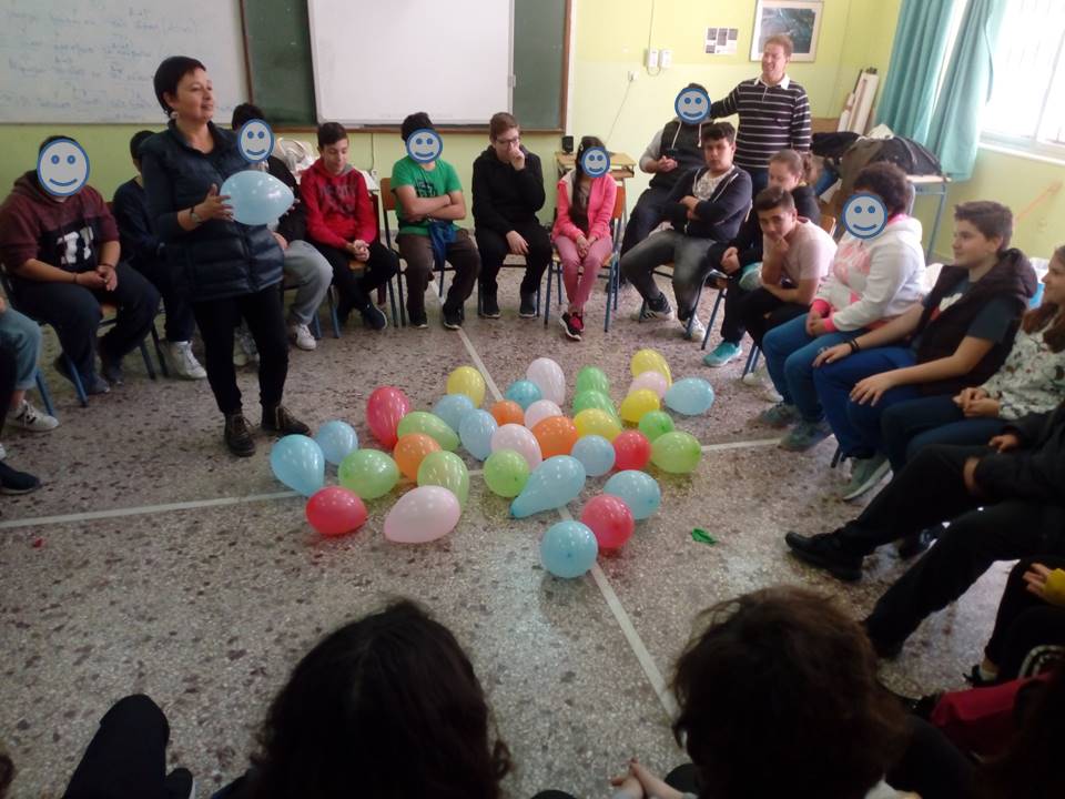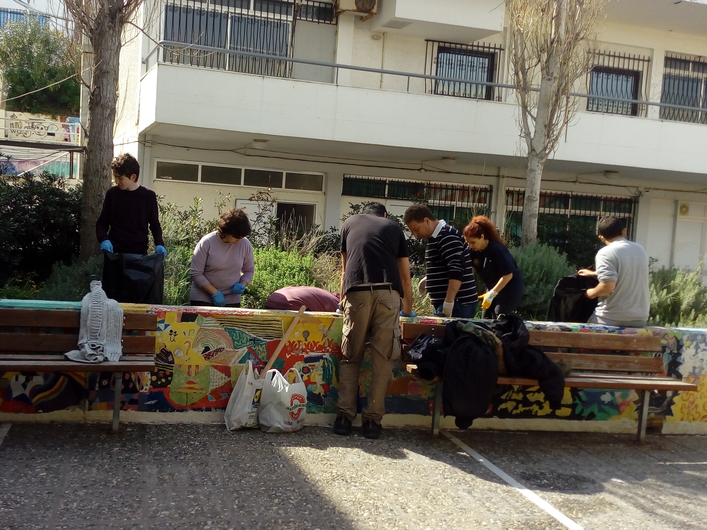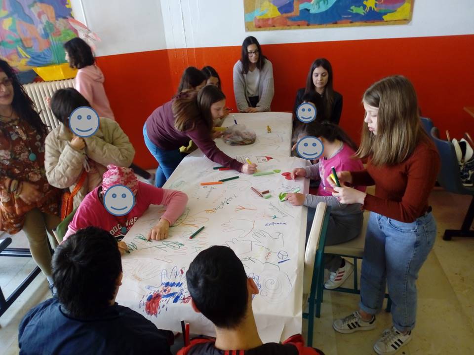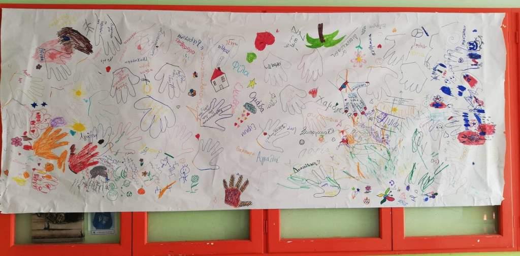Στο γήπεδο του μπάσκετ τα παιδιά σε ομάδες έπαιξαν διάφορα παιχνίδια με μπάλες, συνεργάστηκαν και χαλάρωσαν. Στην πίσω μικρή αυλή μια άλλη ομάδα φρόντισε τον μικρό κήπο. Καθάρισαν τα σκουπίδια, κλάδεψαν τις αγγελικές και κουβάλησαν τα κλαδιά στους κάδους, έβγαλαν αγριόχορτα και ανακάλυψαν τα βότανα που ήταν «κρυμμένα». Μια άλλη ομάδα ασχολήθηκε με τα εικαστικά. Σε χαρτί του μέτρου τα παιδιά των δύο σχολείων δημιούργησαν το δικό τους πίνακα ζωγραφικής αφιερωμένο στη διαφορετικότητα, τη φιλία, την αγάπη και τη συνύπαρξη. Μια ομάδα παιδιών είχε επίσης την ευκαιρία να συζητήσει για τα πράγματα που είναι σημαντικά στη ζωή μας και τις ανθρώπινες αξίες, γράφοντας τες σε χρωματιστά μπαλόνια. Μετά από ένα γευστικό κέρασμα μαζευτήκαμε για μια ακόμη φορά όλοι μαζί – παιδιά και εκπαιδευτικοί – για μια αναμνηστική φωτογραφία με τα μπαλόνια στα χέρια, για να θυμόμαστε όλα αυτά που μας ενώνουν.