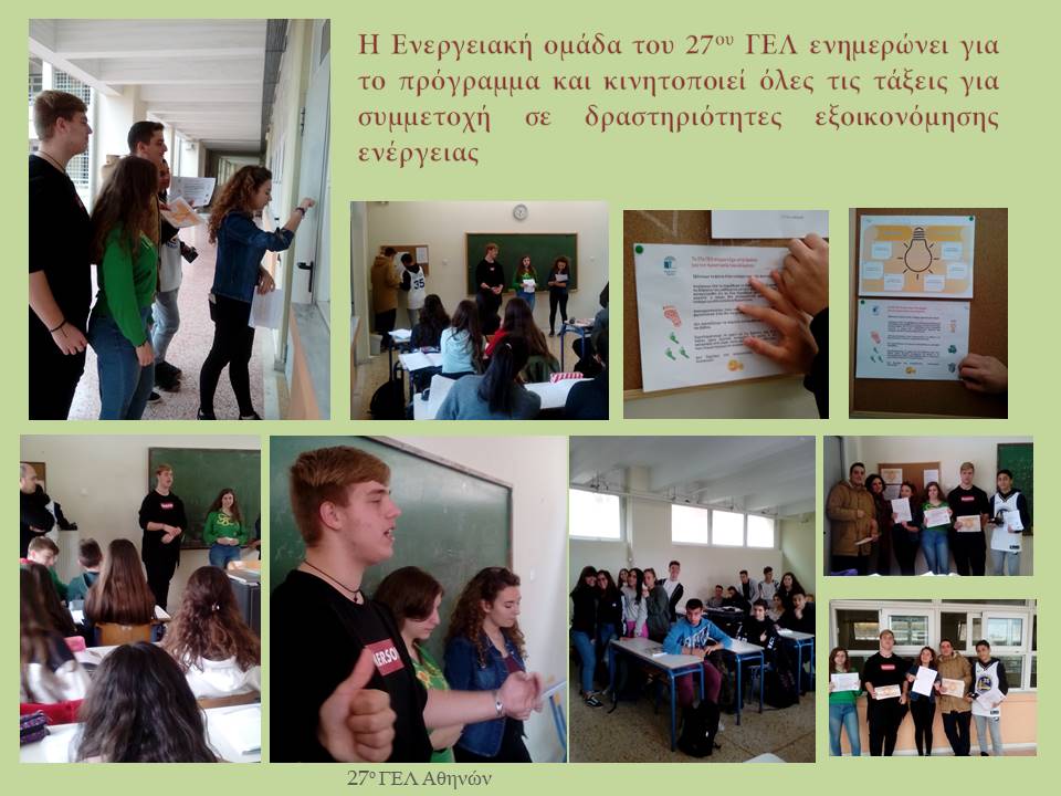 Ομάδα μαθητών που συμμετέχει σε περιβαλλοντικό πρόγραμμα σχετικά με τις επιπτώσεις της κλιματικής αλλαγής και την εξοικονόμηση ενέργειας στο σχολείο, επισκέφτηκε όλες τις τάξεις, ενημέρωσε τους υπόλοιπους ,κόλλησε αφίσες με οδηγίες και όρισε ενεργειακούς επιθεωρητές για έλεγχο. Κάθε 10ημερο, το τμήμα με την πιο οικολογική στάση επιβραβεύεται.