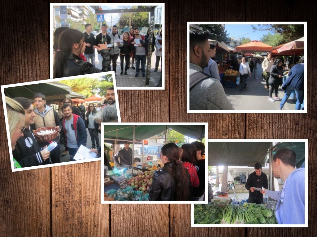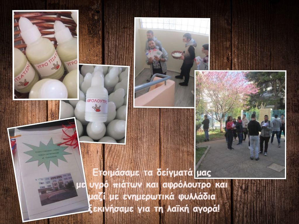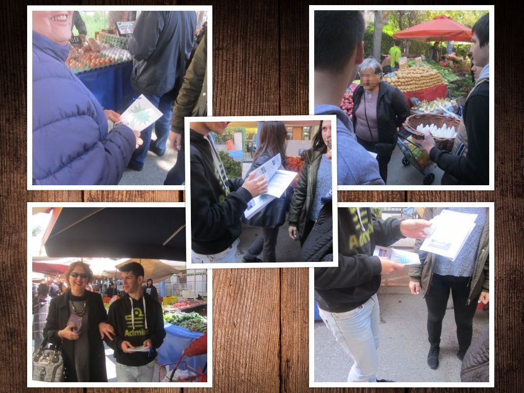 Στις 11.00 ξεκινήσαμε για τη λαϊκή αγορά της γειτονιάς του σχολείου μας. Η ιδέα μας ήταν να μοιράσουμε δείγματα από τα οικολογικά καθαριστικά σπιτιού και το δικό μας χειροποίητο αφρόλουτρο, μαζί με το φυλλάδιο που φτιάξαμε το οποίο περιείχε όλες τις συνταγές με φωτογραφίες βήμα προς βήμα. Εμπειρία ζωής,τόσο για εμάς τους εκπαιδευτικούς και ακόμα περισσότερο για τους μαθητές. Τα συναισθήματα...ανάμεικτα. Πολλοί από τους επισκέπτες της αγοράς δεν σταματούσαν να μας ακούσουν. Λόγια μαθήτριας : "έφαγα τέτοια απόρριψη!!!". Αρκετοί πάλι έψαχναν τις τσέπες τους να μας δώσουν χρήματα και ρωτούσαν "πόσο κάνει?"....δεν έδιναν σημασία στα λόγια μας :"μοιράζουμε δωρεάν δείγματα και τις συνταγές μας..." καμία σημασία. Υπήρχαν φυσικά και αρκετοί οι οποίοι με χαρά, ενθουσιασμό και συγκίνηση μας αγκάλιασαν και επιβράβευσαν τους μαθητές με χαμόγελα για την προσπάθειά τους. Το συμπέρασμα; Δεν τα παρατάμε ποτέ!