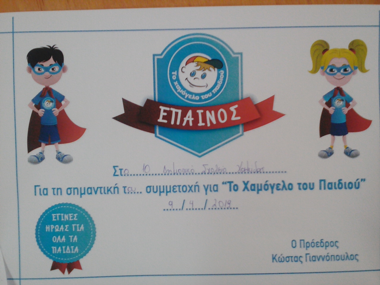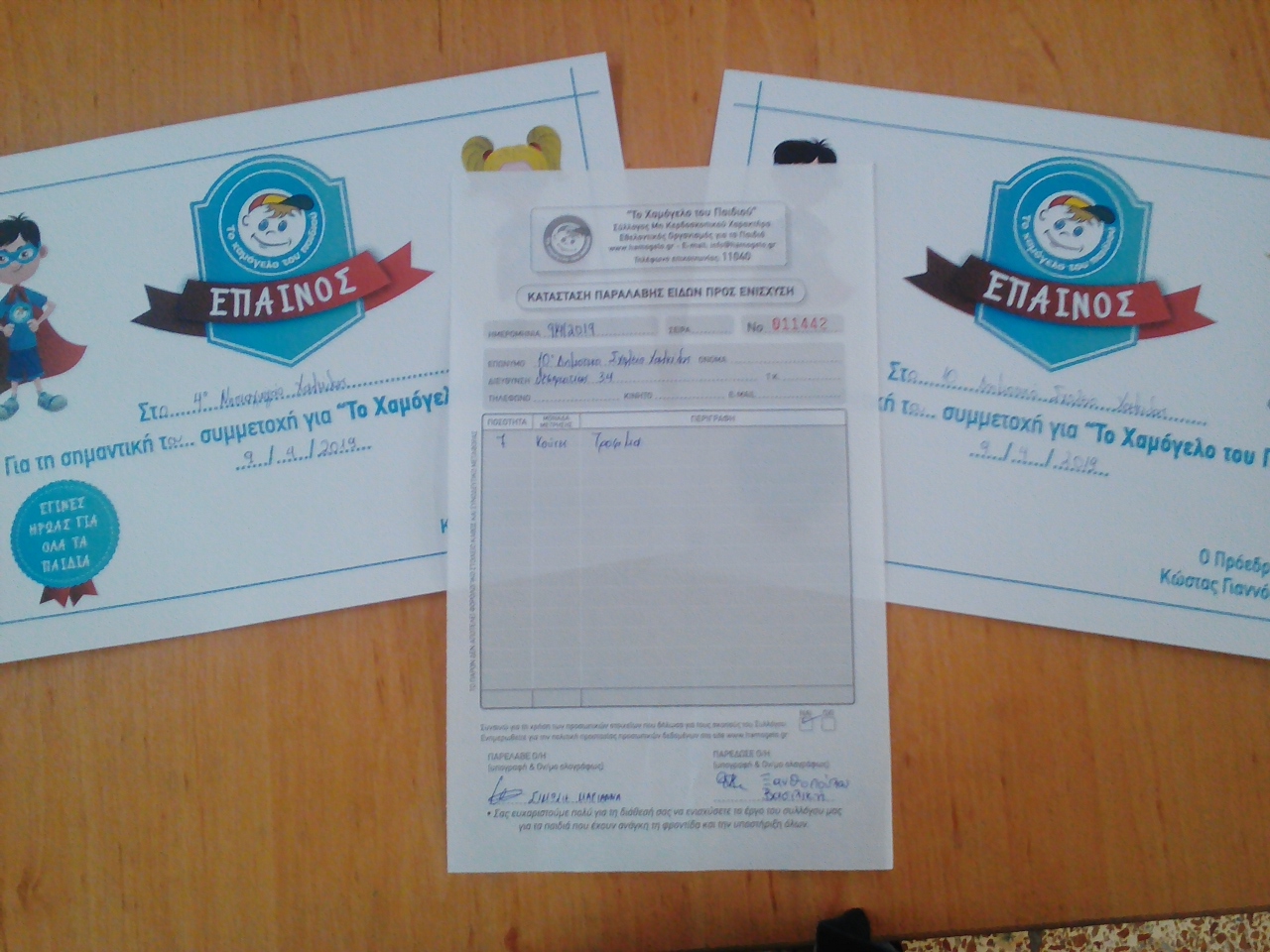 Έτσι, σήμερα ήταν όλα έτοιμα για την παράδοση των ειδών στο «Χαμόγελο του Παιδιού». Οι πολύτιμοι βοηθοί μας, οι γονείς, μετέφεραν τις κούτες στα γραφεία του Οργανισμού. Εκεί, οι υπεύθυνοι μας ευχαρίστησαν και τόνισαν το πόσο σημαντική είναι αυτή μας η προσφορά, όχι μόνο για τα υλικά αγαθά, αλλά και ως διαμόρφωση μιας θετικής στάσης των μαθητών απέναντι στην προσφορά βοήθειας στον συνάνθρωπο. Μάλιστα μας πρόσφεραν και από έναν έπαινο για το Δημοτικό και το Νηπιαγωγείο.