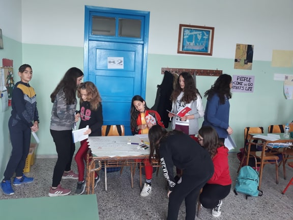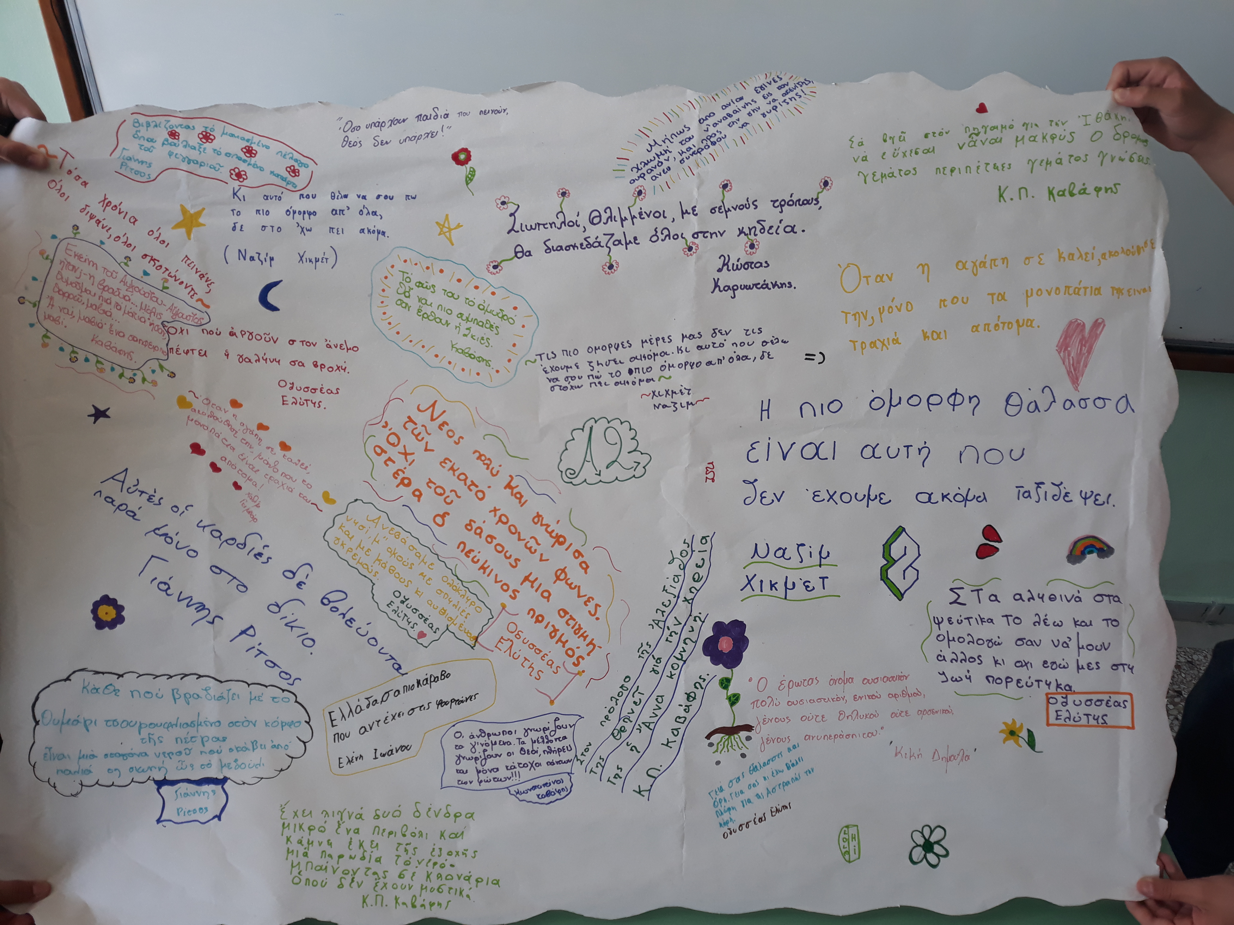 Στα παιδιά της Α' Τάξης Γυμνασίου διανεμήθηκαν έργα σημαντικών ποιητών, όπως του Καβάφη, του Ρίτσου και του Ελύτη, και τους ζητήθηκε να επιλέξουν κάποιους στίχους ή δίστιχα, που θεωρούν ότι τους εκφράζουν και ότι αγγίζουν τον ψυχικό τους κόσμο. Τα παιδιά, λοιπόν, καθ' όλη τη διάρκεια της διδακτικής ώρας διάβαζαν ποίηση και αποτύπωναν σε ένα μεγάλο χαρτί τους στίχους της επιλογής τους. Το αποτέλεσμα ήταν εκπληκτικό και πλέον κοσμεί την τάξη μας!