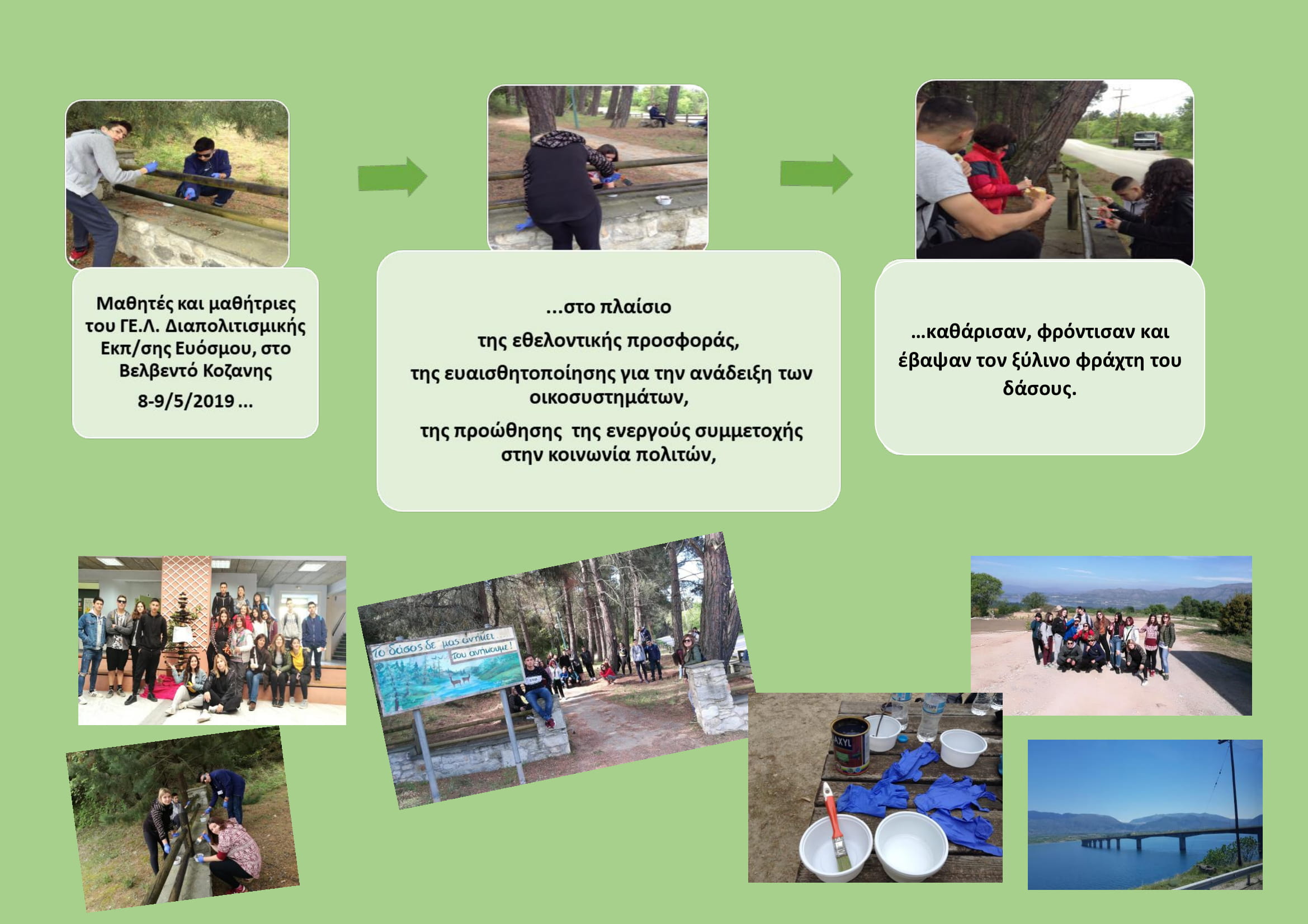 Μαθητές & μαθήτριες του ΓΕ.Λ Διαπολιτισμικής Εκπαίδευσης Ευόσμου, στις 8 και 9 Μαΐου, στο πλαίσιο της εθελοντικής προσφοράς, της ευαισθητοποίησης για την διατήρηση αλλά και την ανάδειξη των οικοσυστημάτων, στο Βελβεντό καθάρισαν, φρόντισαν και έβαψαν τον ξύλινο φράχτη του δάσους. Προσπαθούμε να προωθούμε την ενεργό συμμετοχή στην κοινωνία των πολιτών.