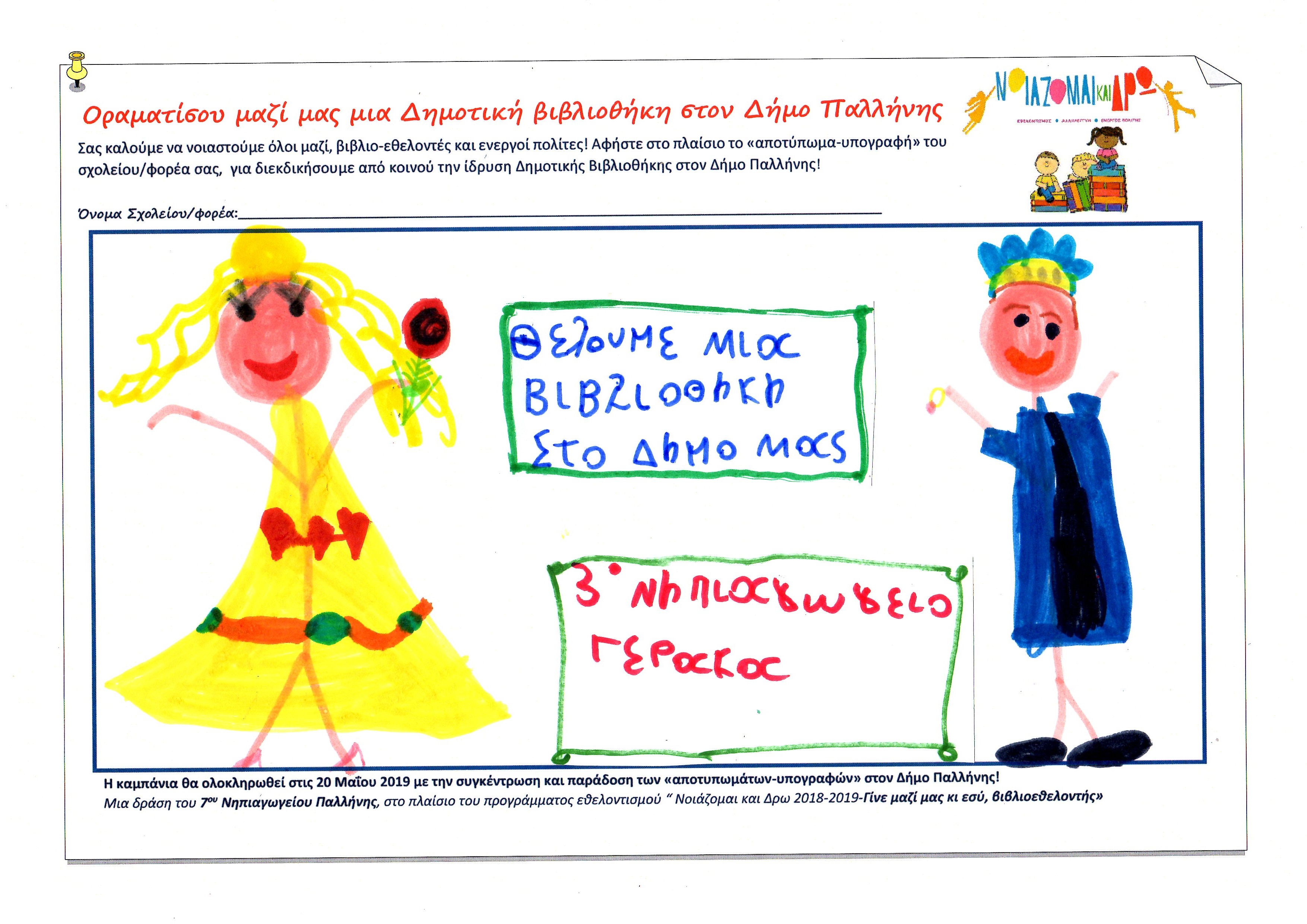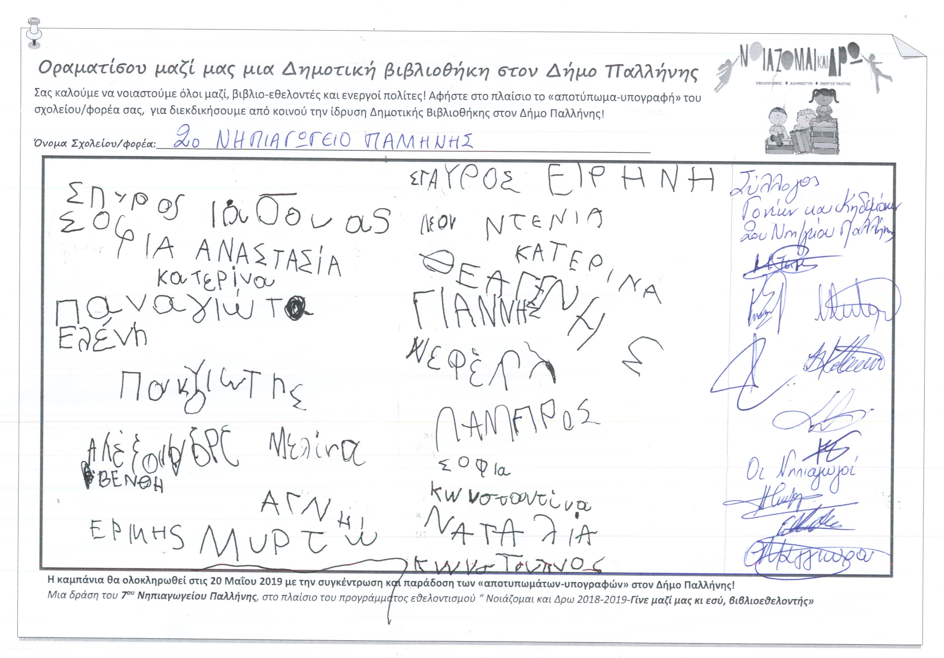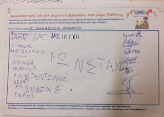Οι βιβλιοεθελοντές του 7ου Νηπιαγωγείου Παλλήνης απευθύνουν κάλεσμα συγκέντρωσης υπογραφών στα σχολεία και στους Συλλόγους Γονέων του Δήμου Παλλήνης για να νοιαστούμε όλοι μαζί  και να διεκδικήσουμε από κοινού ίδρυση Δημοτικής Βιβλιοθήκης . Το κάλεσμα στάλθηκε στα σχολεία του Δήμου μας και οι πρώτες υπογραφές άρχισαν να συγκεντρώνονται...
